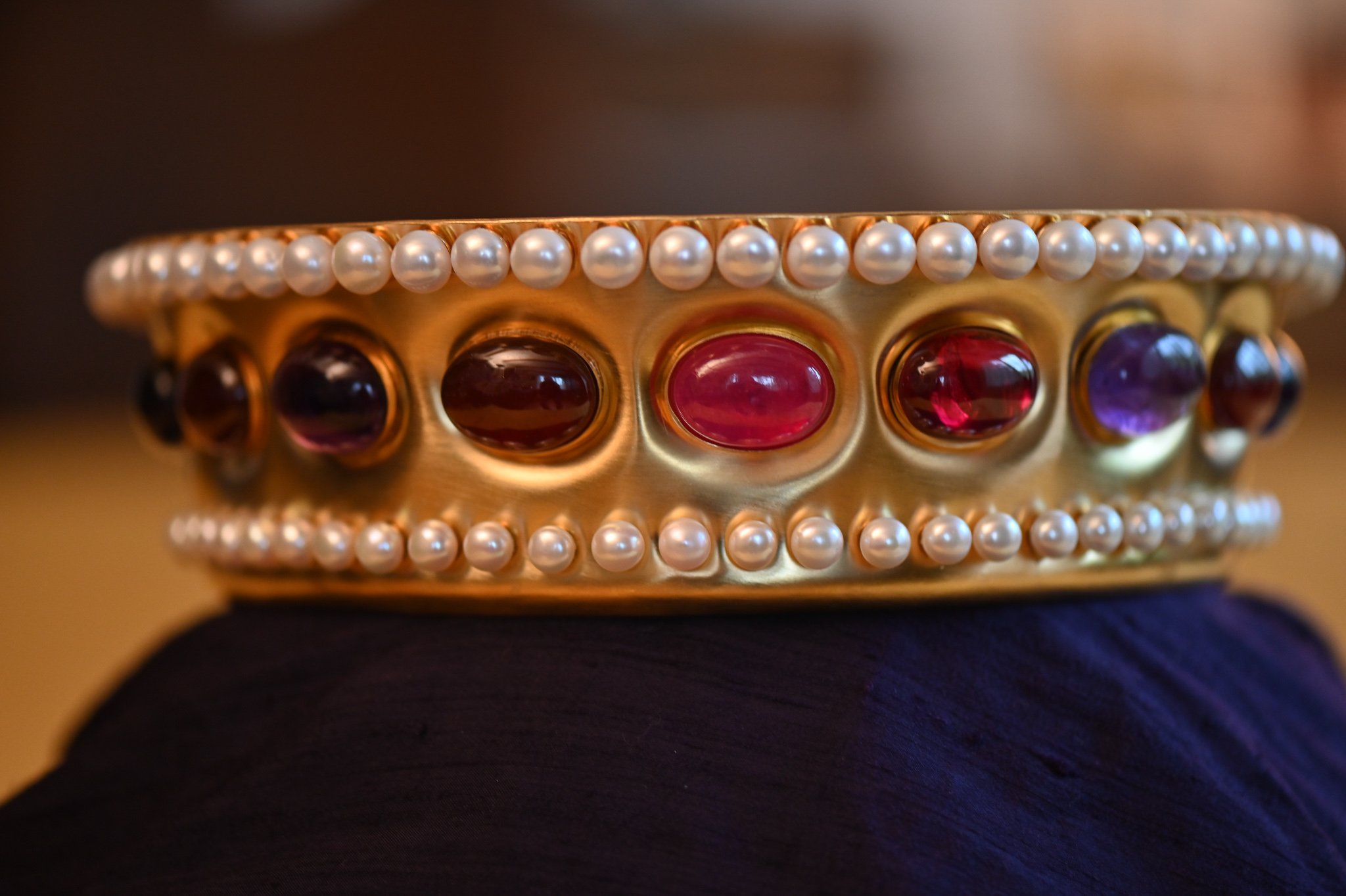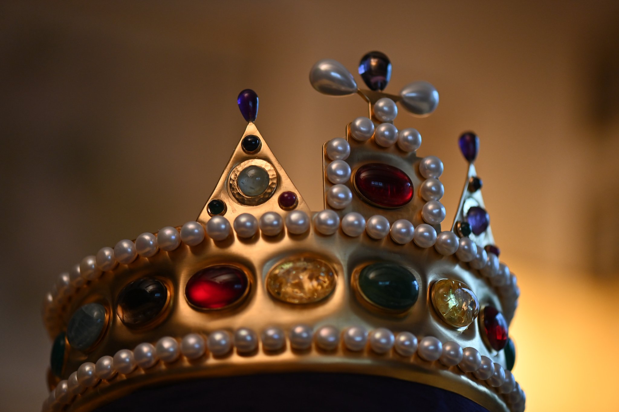 Die Kronen sind nach Vorlagen von alten Bildern aus Messingblech von mir getrieben. Danach vergoldet und von der Kundschaft mit Glasperlen bestückt,