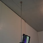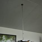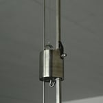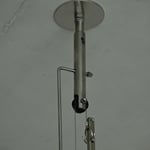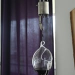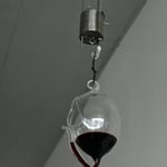 Das mundgeblasene Spezialglas wird am Haken mittels O-Ring aufgehängt (flexibel, um einen Glasbruch zu verhindern). Durch das Gewicht und die kabelgeführte Konstruktion (siehe Bild 5/6/7) über eine Rolle ist die Höheneinstellung einfach handhabbar. Die Versetzmöglichkeit erfolgt ebenfalls über einen Bajonettverschluss an der Decke (siehe Bild 4)